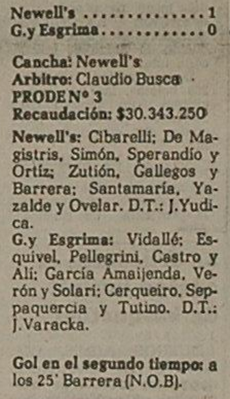 + NEWELL'S OLD BOYS: Civarelli; Aguerópolis, Simón, Daniel Pedro Killer y Sperandío; Bulleri, Gallego y Alfaro; Santamaría, Yazalde y Barrera (J Cortéz). DT: José Yudica.